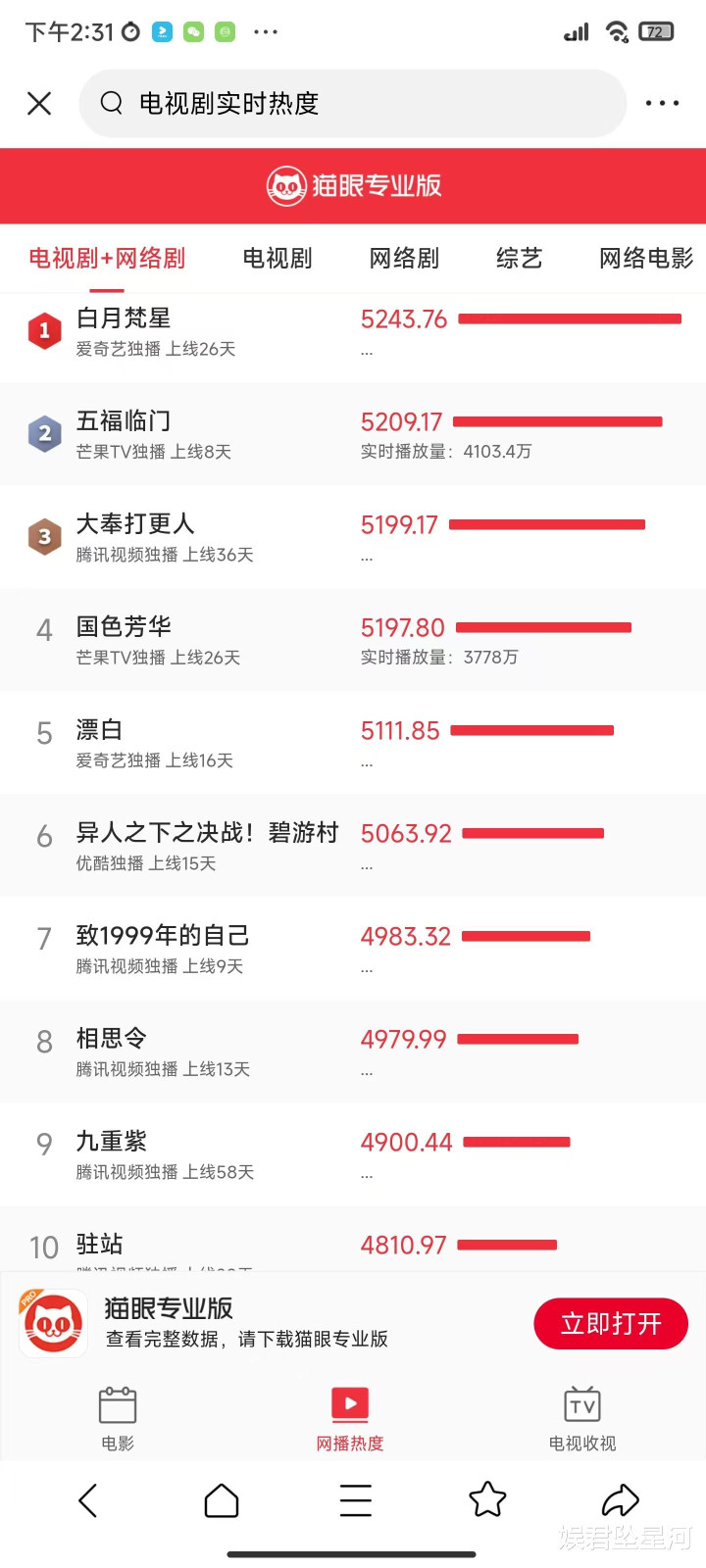 电影市场非常热闹,但电视剧市场就稍显落寞,大家都关注春节档电影,加上春节各种娱乐活动涌现,给人感觉没啥人关注电视剧了。从“猫眼专业版”实时数据显示可知,当前热播电视剧中,全网热度最高的5部剧有4部都是已经完结的剧,正在播出的新剧只有《五福临门》冲进了前5名位居第1名。